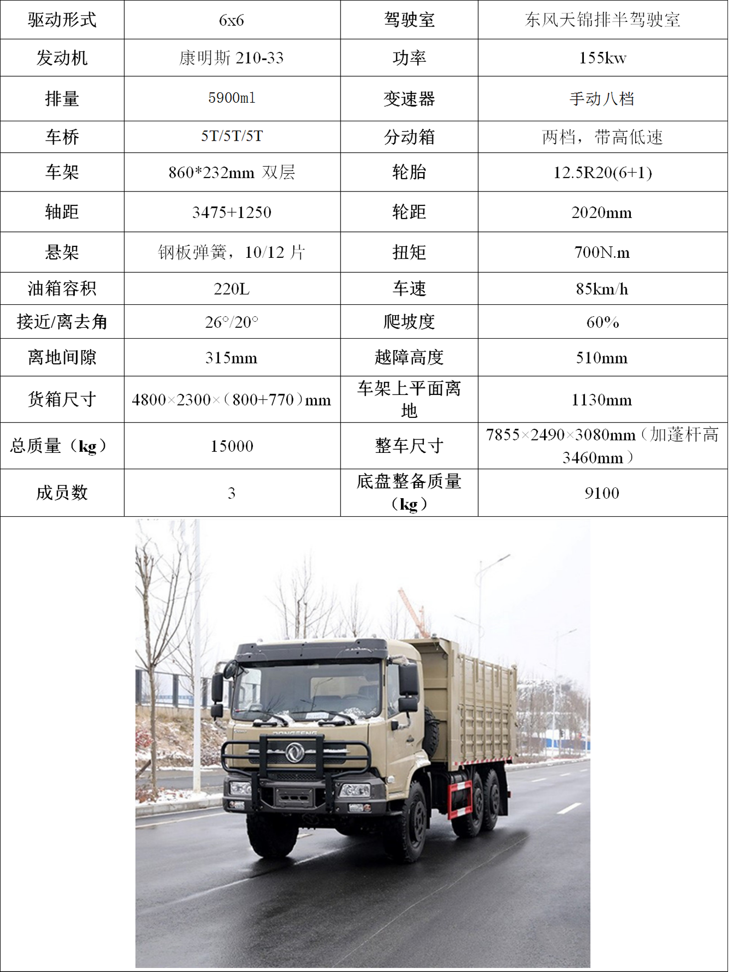 6X6全驱平头210HP仓栏货车 东风天锦排半驾驶室